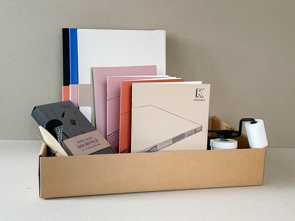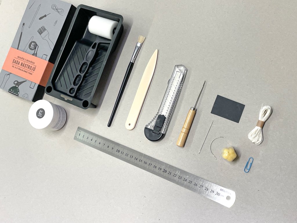 Návody + papíry + nástroje = plná nálož knihařiny